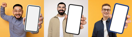 Group of Men Holding Up Blank Smartphones on Colorful Background