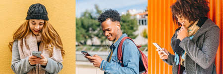 Group of young people using smartphones. Multiscreen montage, split screen collage. Technology concept