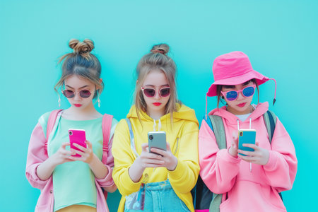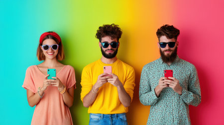 Three young adults engaged with their smartphones stand against a vibrant backdrop. Their casual outfits and cheerful expressions highlight modern communication and friendship.