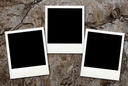 Three blank photo prints pinned to a cork notice board. Space for copy. Paths provided.