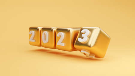 Golden cube flipping change 2022 to 2023 on yellow background for preparation happy new year , merry Christmas and start new business concept by realistic 3d render illustration.
