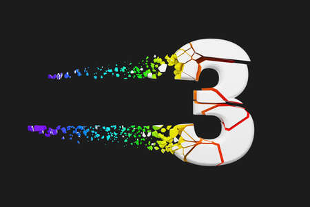 Broken shattered iridescent alphabet number 3. Crushed white and rainbow font. 3D render isolated on gray background. Typographic symbol from spectrum cracked debris.
