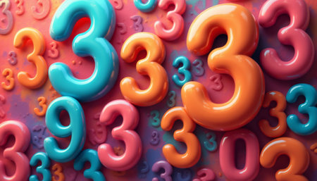 A vibrant collage of oversized, glossy numbers 3 in various colors creates a fun and energetic atmosphere. This lively composition invites viewers to explore the joy of numbers, making it perfect for educational or playful themes.