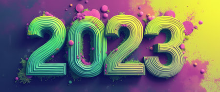 The striking numbers 2023 are crafted in a bold, layered design, bursting with vibrant colors and playful textures. This eye-catching composition, featuring splashes of paint and organic elements, evokes a sense of celebration and creativity, perfect for marking the end of a year filled with memories and new beginnings.