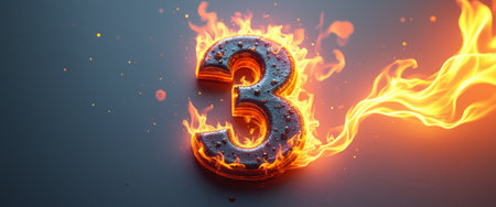 A striking number three, crafted from textured material, bursts into flames, creating a dynamic and energetic visual. The fiery effect symbolizes excitement and celebration, perfect for marking special occasions or milestones.