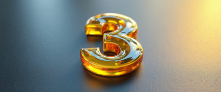 A stunning, translucent golden number three glimmers against a smooth, dark surface, capturing light beautifully. This eye-catching design evokes a sense of luxury and modernity, perfect for branding or artistic projects.