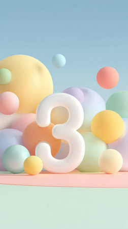 A vibrant image featuring the number three surrounded by colorful spheres against a soft pastel backdrop.