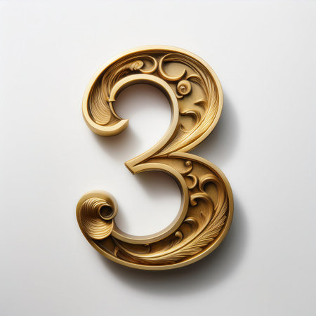 This artistic representation features a beautifully crafted number three in gold metal, adorned with spiral engravings against a light backdrop.