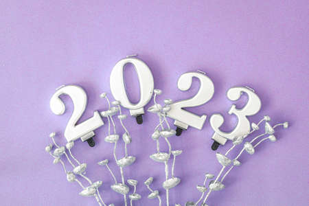 Lilac Christmas background with numbers 2023 and decor details, flat lay.