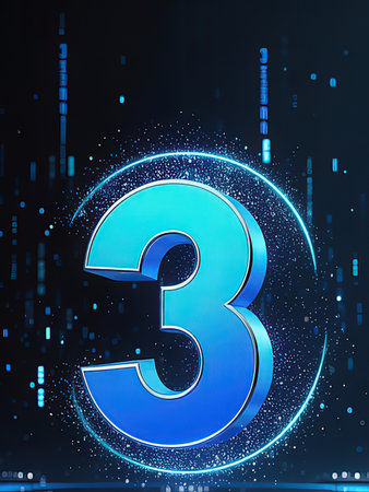 Glowing Digital Number Three on Shiny Abstract Surface with Particle Effects Background