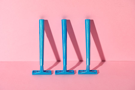 Blue disposable razors on pink paper background