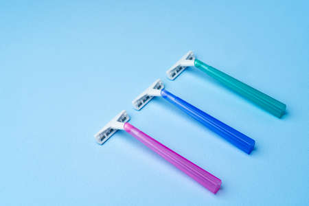 multicolored razor shavers. Colored razors shavers, on a blue background. copy space for text. view from above.