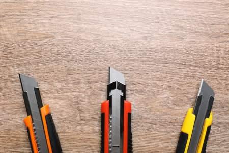 Three different utility knives on wooden table, flat lay. Space for text