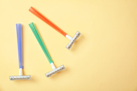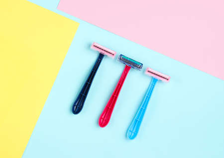 Minimalistic beauty concept. Epilation. Plastic colored razors on pastel background. Top view