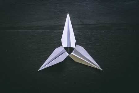 Origami paper planes placed in the middle of a black slate as background - White handmade toy airplanes on stone surface