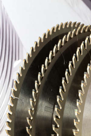 Circular saw blades. carpentry tools. industrial background. equipment for sawmill and sawing wooden products
