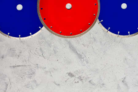 Industrial cut-off diamond discs of blue and red color for cutting concrete, reinforced concrete and granite on a gray concrete background. Copy space, close-up.