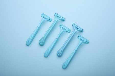 Four blue disposable razors on a blue background. Tools for facial care. Set for care of a man's face.