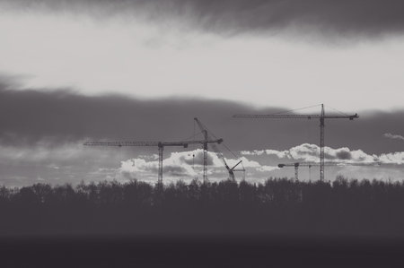Black and white photograph showing several construction cranes above a row of trees under a dramatic cloud cover an impressive depiction of a modern construction site in a wide landscape.