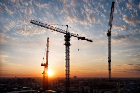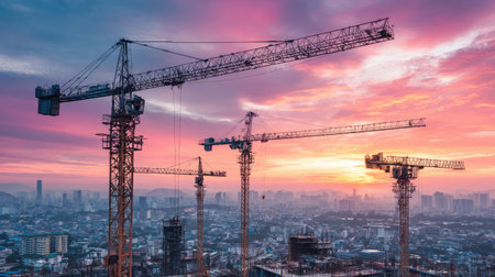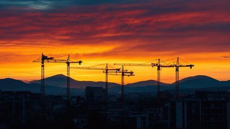A breathtaking view of a construction site at sunrise, featuring multiple tower cranes silhouetted against a vibrant sky, symbolizing urban development.