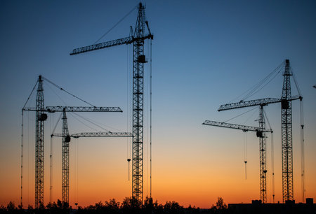 Silhouettes of tower cranes at sunset, shaping the skyline of a developing urban city.
