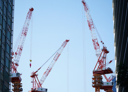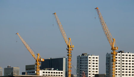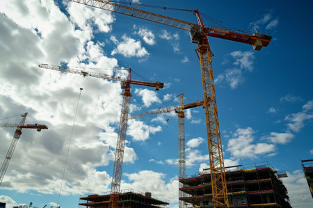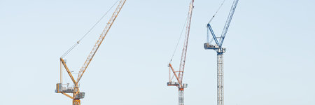 Majestic Tower Cranes Against a Bright Blue Sky in an Urban Construction Site Setting