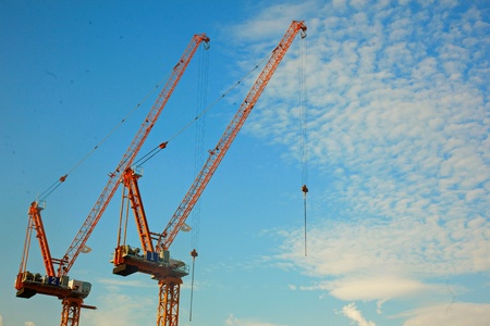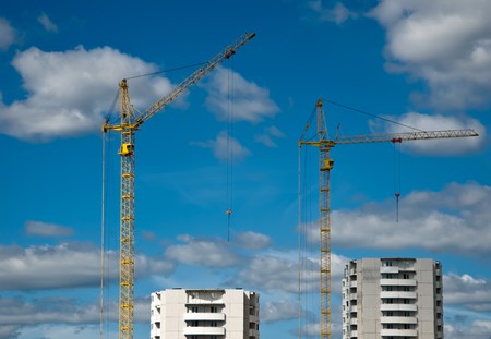 photographed close-up construction cranes during construction of a new multi-storey apartment building, blue sky and clouds,