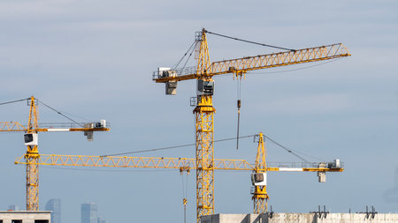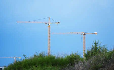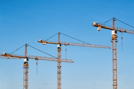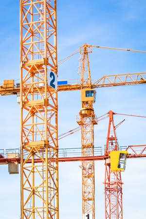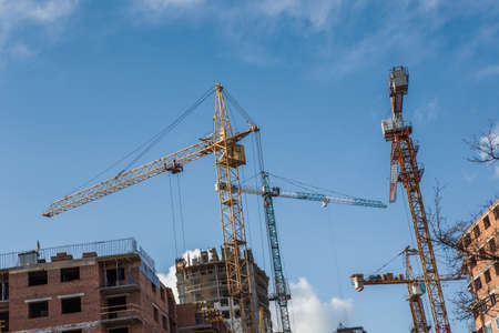 hoisting construction cranes on construction site against blue sky, construction of houses concept
