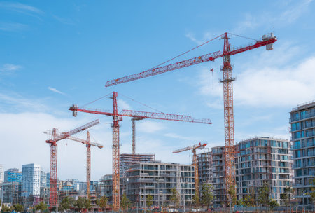 Several construction cranes are positioned over buildings in a cityscape, set against a bright blue sky. The scene is dominated by red and orange tones from the cranes, with the building structures in various stages of completion. This imagery could be used for architectural, urban planning, or construction-related commercial projects.