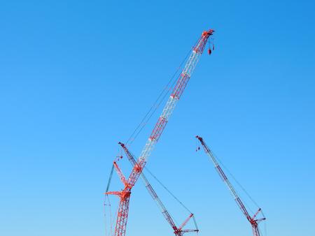 Several large construction cranes stand prominently against a bright blue sky, overlooking a partially built structure. The image showcases the machinery's height and orange color, contrasting with the sky. Ideal for illustrating construction, engineering, and infrastructure projects, the photo could be used for diverse commercial purposes.