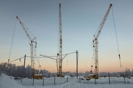 Construction site. Many tower cranes on dusk blue sky background. Construction multi-storey residential and commercial real estate. Industry new building business. Mortgage concept.