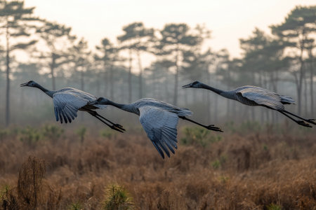 Three cranes fly over wetlands shrouded in mist, showing their wings as they embody the symbol of longevity in Japanese culture.