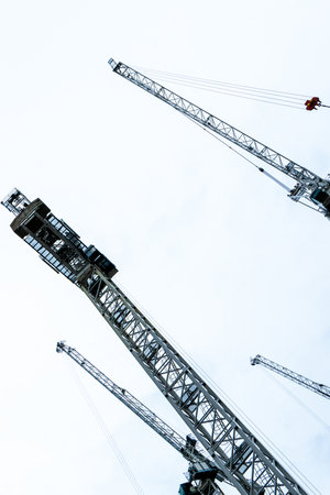 Modern coal terminal in Riga, Latvia. Cranes close-up. Baltic sea. Freight transportation, logistics, global communications, economy, business, industry, supply, special equipment. Urban landscape