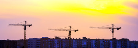 silhouettes of building cranes in the evening sky against the backdrop of sunset. urban building industry