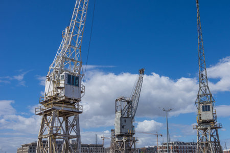 Industrial construction cranes with blue sky and white clouds. Filtered image processed vintage effect.