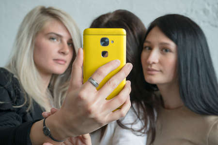 Three beautiful young cute girlfriends make selfie, photo on gray phone, smiling and laughing in office during lunch break. Girls with black hair and blond girl