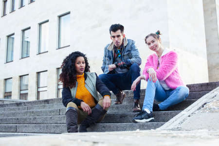Portrait of group of three friends looking sideways in the street.