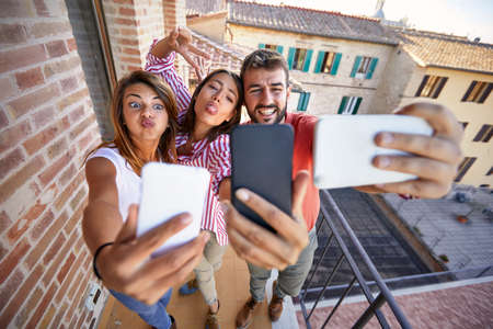 Group of cheerful friends taking a selfie on the terrace on a beautiful day. Friendship, together