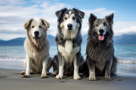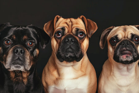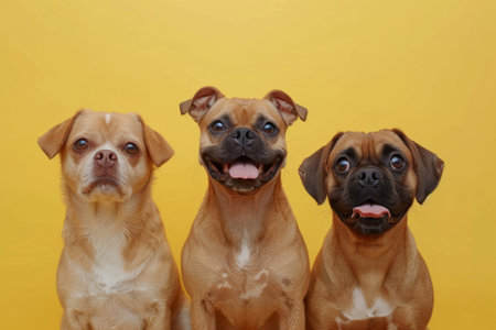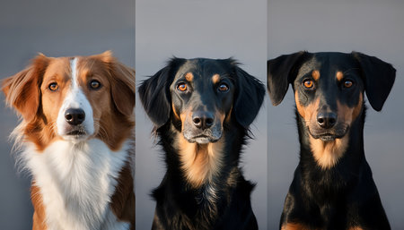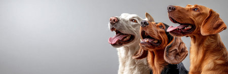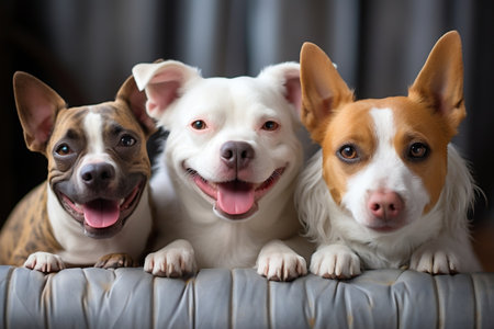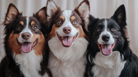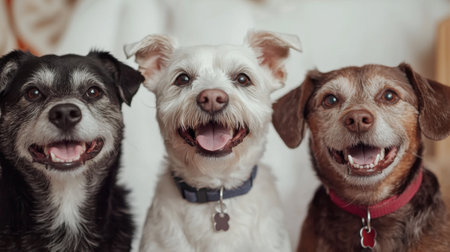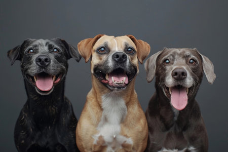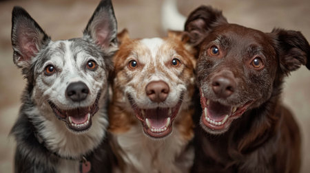 A trio of delighted dogs stands out in a sleek gray setting, capturing hearts with their happy expressions and playful energy.