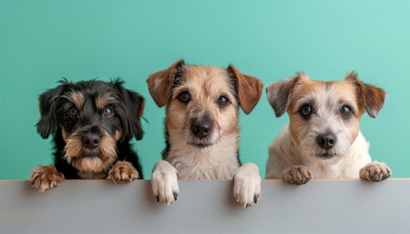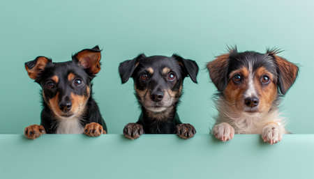 light turquoise background, three adorable dogs of different breeds. Generated by artificial intelligence.