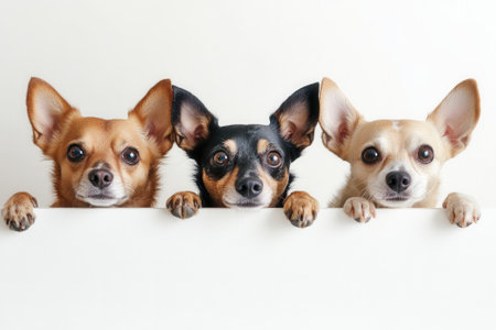 Three adorable dogs peeking over a white surface