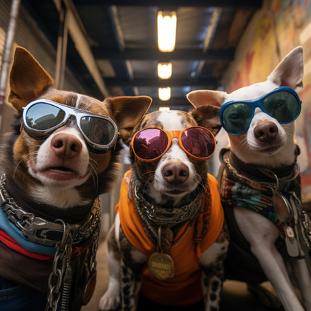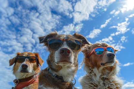 Three fashionable dogs with sunglasses looking cool against a blue sky with fluffy clouds