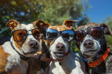 Three adorable dogs with stylish sunglasses enjoying the sunshine in a lighthearted outdoor setting