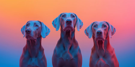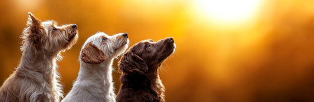 A Three dogs of different breeds look up against warm sunset background, showcasing their curiosity and companionship. scene evokes sense of wonder and tranquility