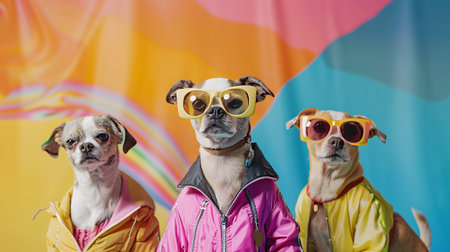 Group of three dogs in colorful raincoat and sunglasses on a colorful background