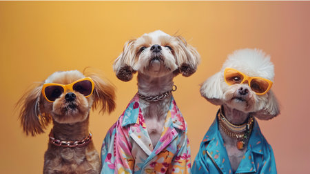 Three Shih Tzu dogs wearing sunglasses on yellow background. Studio shot.