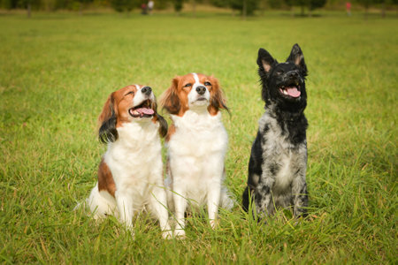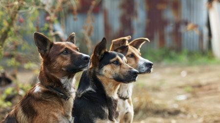 Portrait of three dogs. They are sitting in summer nature.