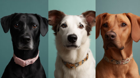 Three playful dogs showcase their friendly personalities against colorful backgrounds