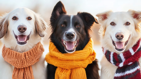 Happy dogs wearing colorful scarves pose together in snowy setting, showcasing their playful and friendly nature. Their joyful expressions bring warmth to chilly environment.