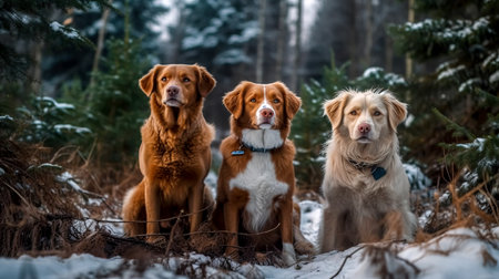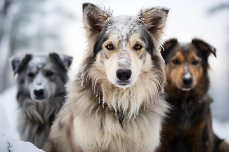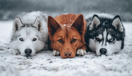 Three dogs are captured in a close-up shot, their faces resting on a snowy surface. The composition showcases a range of colors from brown to grey and black. The scene suggests a winter environment with soft lighting, and it can be used for various commercial or illustrative projects.